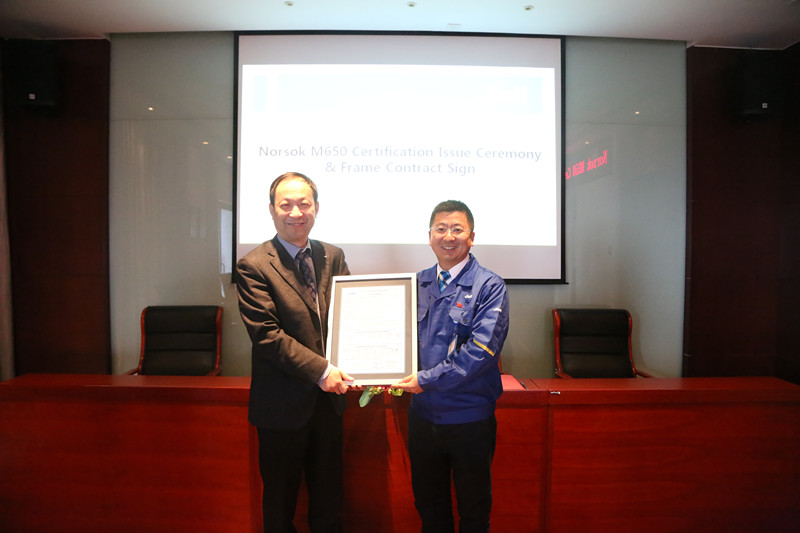 挪威國家石油標準NORSOK M-650是一個全球公認的特材製造商資格認可的標準。它是支持石油公司和天然氣公司對其供應商的認可。現已被挪威國家石油公司、康菲石油公司、埃克森美孚石油公司、BP石油公司、殼牌石油公司和阿克-克瓦納集團所廣泛采用。NORSOK M-650認證的通過無疑既是肯定,又是一種激勵。它體現了全球石油天然氣行業對公司產品的認可,為公司開拓更寬廣的市場提供了契機;也激勵了公司不斷提高產品、過程和服務質量,增加客戶滿意度,為全球工業裝備提供自己安全可靠的產品。