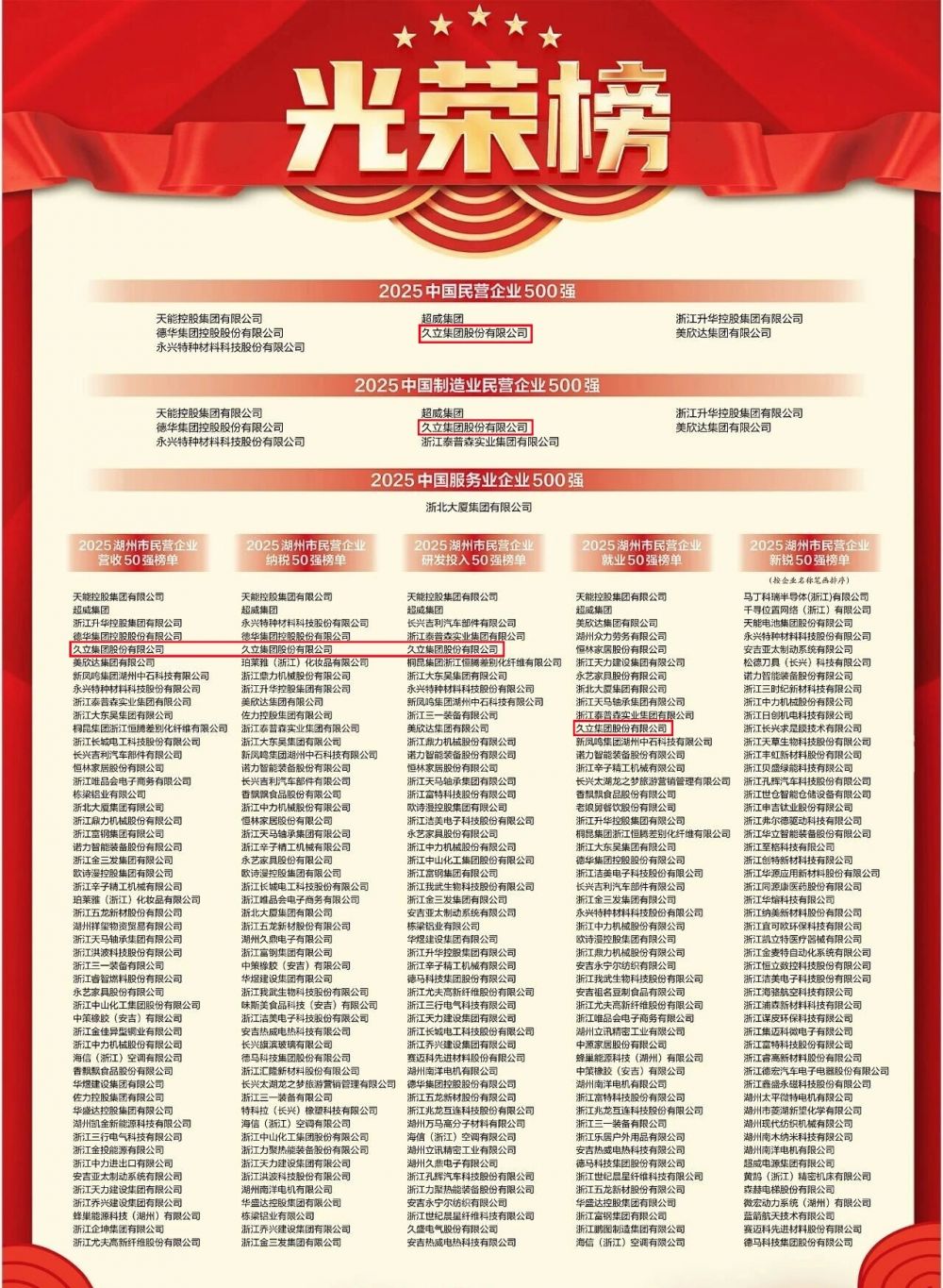 活動現場,市人大常委會主任孫賢龍、市政協主席李上葵為入圍2025中國民營企業500強係列榜單的企業頒獎。久立集團憑借2024年的經營業績,再次榮登“中國民營企業500強、中國製造業民營企業500強”兩大榜單,分別位列第338位和第240位。久立集團董事長章宇旭代表公司登台接受榮譽。